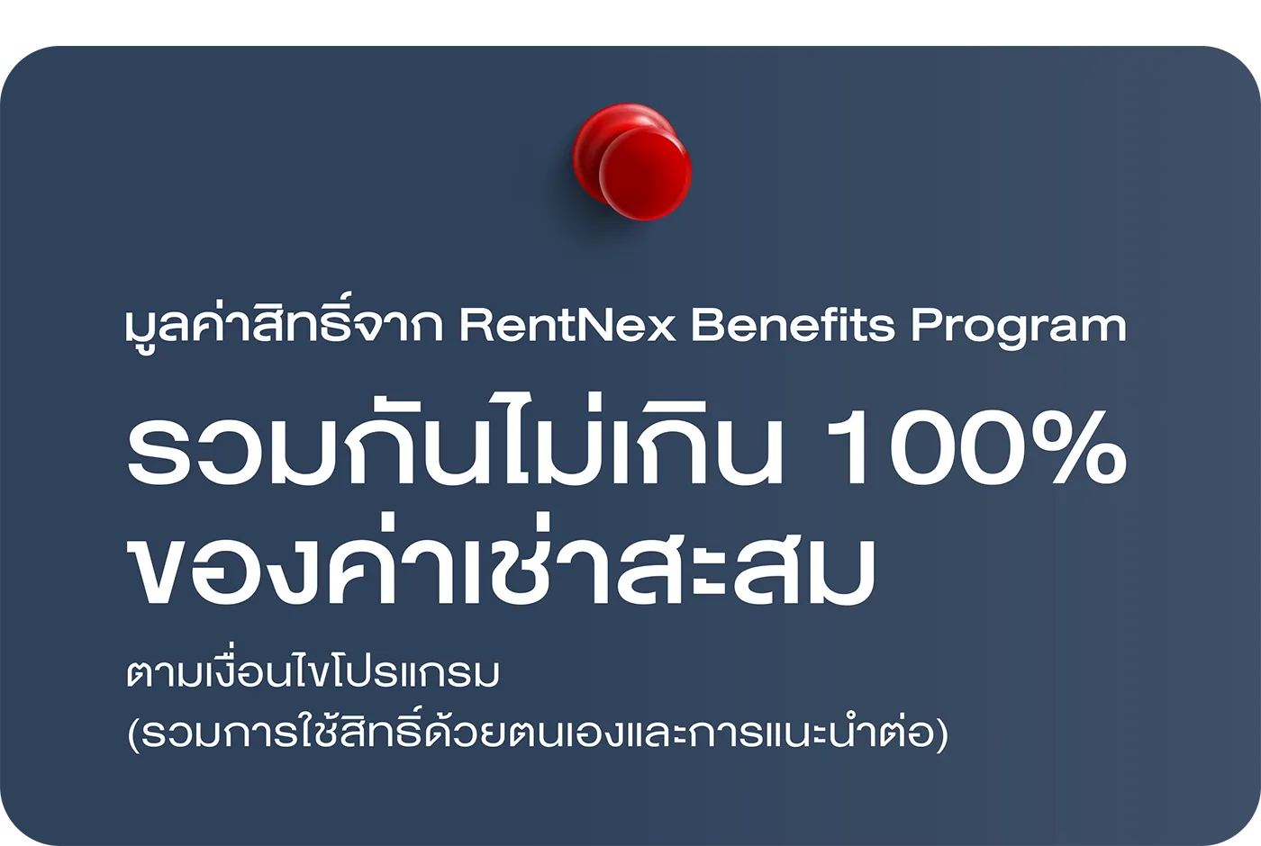 มูลค่าสิทธิ์จาก RentNex Benefits Program (รวมการใช้สิทธิ์ด้วยตนเองและการแนะนำต่อ) จะรวมกันแล้วไม่เกิน 100% ของค่าเช่าสะสม ตามเงื่อนไขโปรแกรม